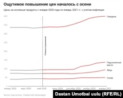После снятия жесткого карантинного режима основные продукты начали дорожать. Например, лимон и чеснок, которые якобы помогают не заболеть коронавирусом, начали резко дорожать в апреле, а говядина - в августе. В сентябре начали расти цены на яйца, подсолнечное масло и сахар.